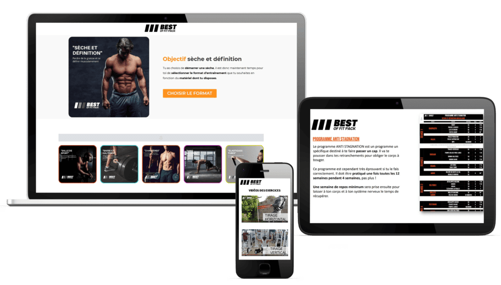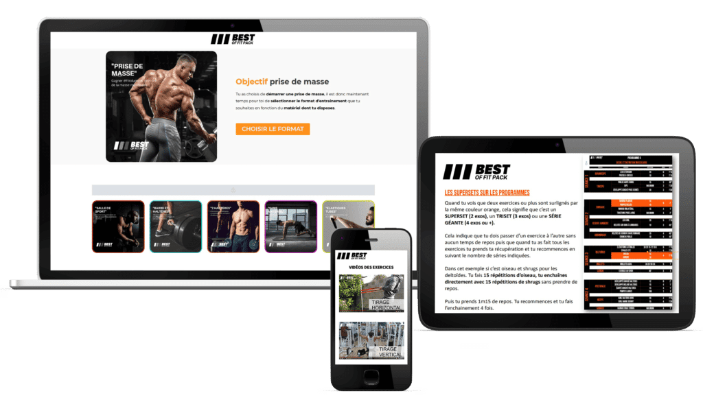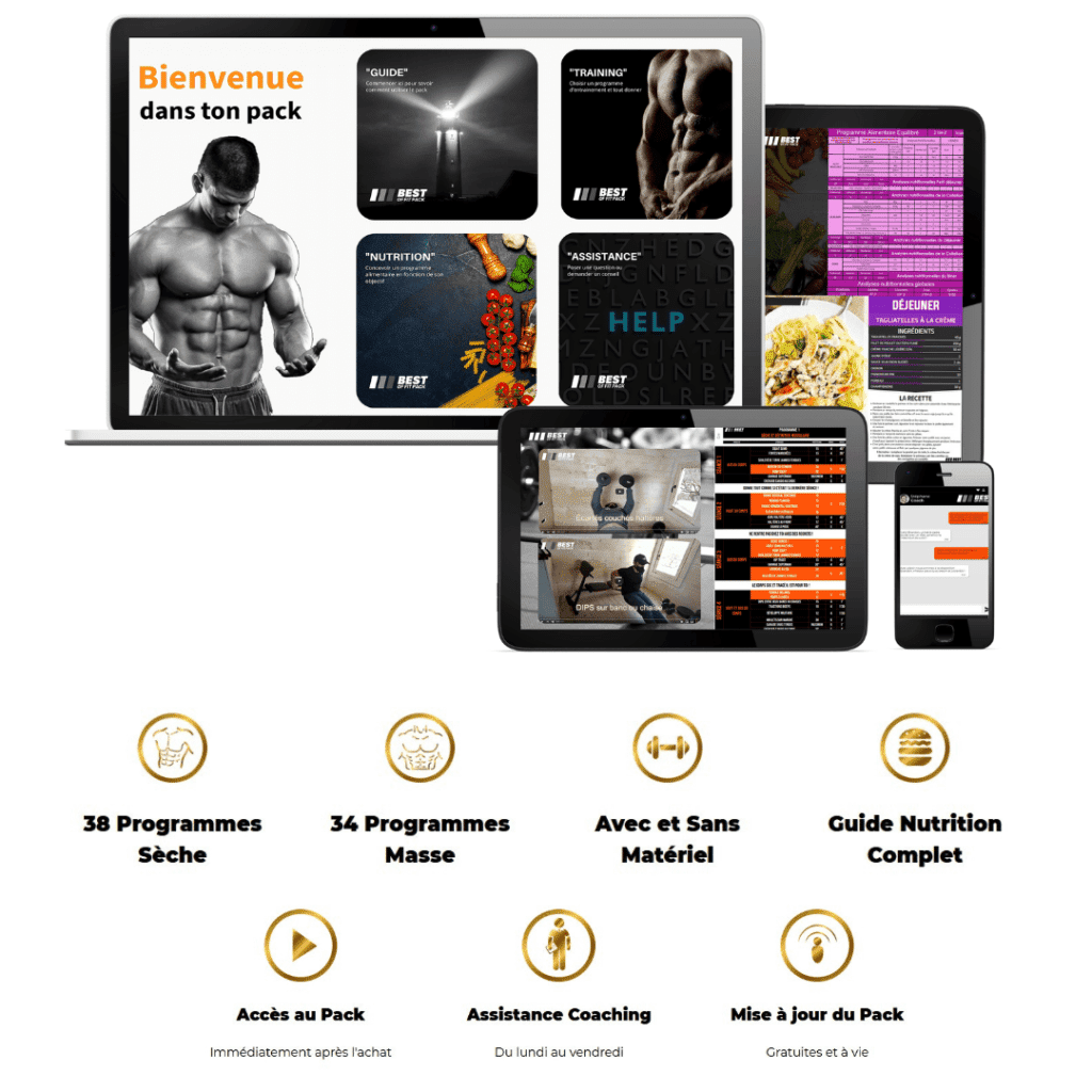 Tu trouveras dans ce pack les 72 meilleurs programmes d’entraînement, réalisables avec ou sans matériel pour prendre de la masse et sécher. Est également inclut un guide nutritionnel complet avec des recettes ainsi qu’une assistance coaching gratuite. Accessibles instantanément depuis ton smartphone, ta tablette ou ton pc via un accès en ligne.