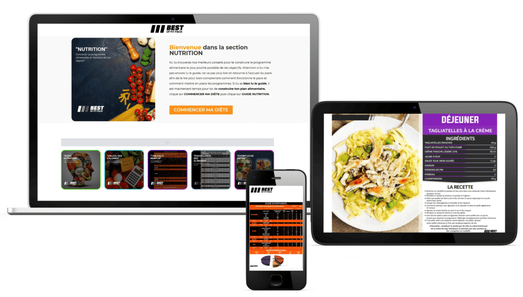 Avec les 72 programmes sont également proposés les vidéos des exercices, un guide nutritionnel, des plans alimentaires avec recettes par tranches caloriques et une assistance coaching gratuite du lundi au vendredi pour poser toutes tes questions.