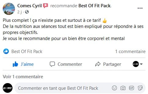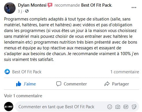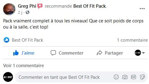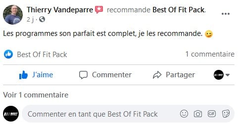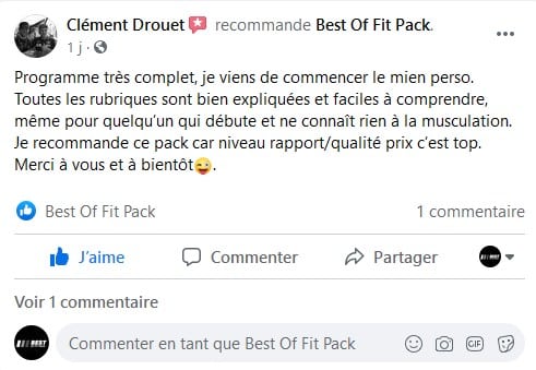 « Je n’avais pas envie de payer un coach et les influenceurs m’ont souvent déçu, le pack a fait le job, j’ai tout ce qu’il faut et je fait ma sèche et ma prise de masse dans la foulée sans me prendre la tête. J’ai eu quelque questions et ils répondent sur la page, c’est vraiment cool merci ! »
