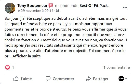 « Je n’avais pas envie de payer un coach et les influenceurs m’ont souvent déçu, le pack a fait le job, j’ai tout ce qu’il faut et je fait ma sèche et ma prise de masse dans la foulée sans me prendre la tête. J’ai eu quelque questions et ils répondent sur la page, c’est vraiment cool merci ! »